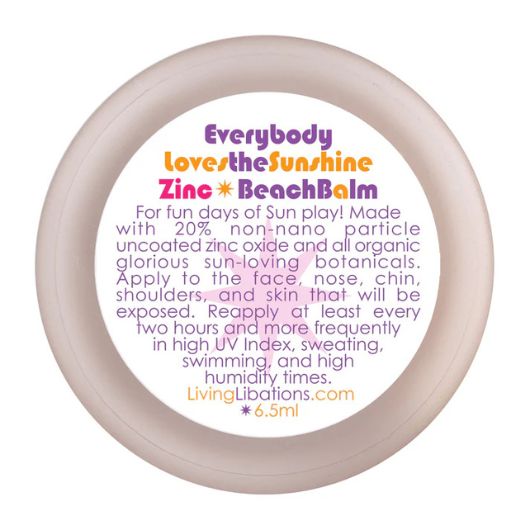 Living Libations Everybody Loves the Sunshine with Zinc – Beach Balm is een voedende, natuurlijke zonnepasta gemaakt met een heleboel zonminnende plantaardige ingrediënten en ongestreken zinkoxide zonder nanodeeltjes.
