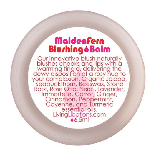 Living Libations Maiden Fern Blushing Balm is the blush that blushes you. Maiden Fern Blushing Balm will make you blush – literally! Our innovative blush is naturally bursting with warming botanicals that increase vitality to lips and cheeks. It gets the juices flowing to deliver a playful, rosy hue where you want it most. This blooming-blush tint is enriched with extractions of juicy roots, replenishing seabuckthorn berries, activating essential oils and a hint of cayenne to create a rosy hue that gorgeously glows on you.
